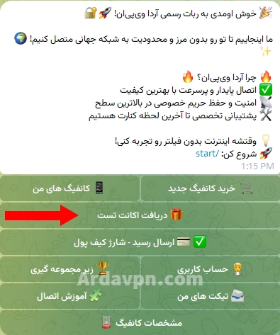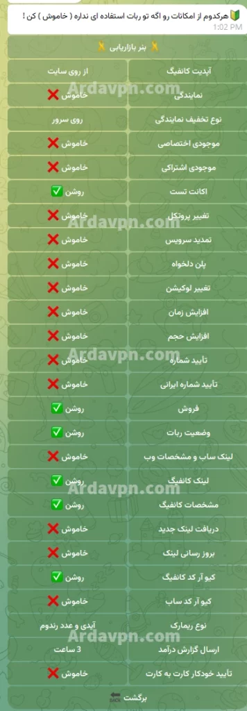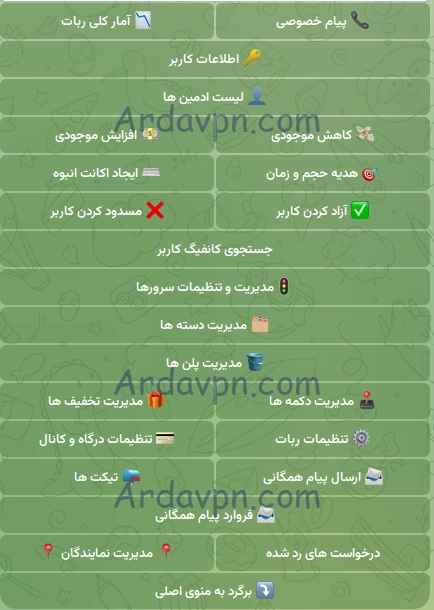 قابلیت های ربات تلگرام فروش کانفیگ V2ray آردا وی پی ان
