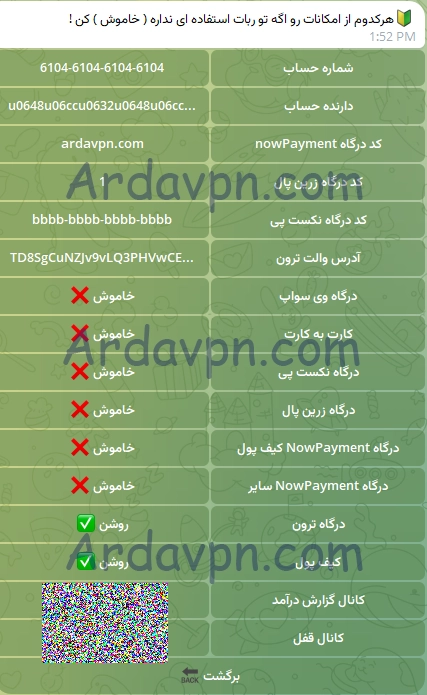 تنظیمات درگاه پرداخت ربات آردا وی پی ان